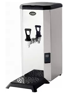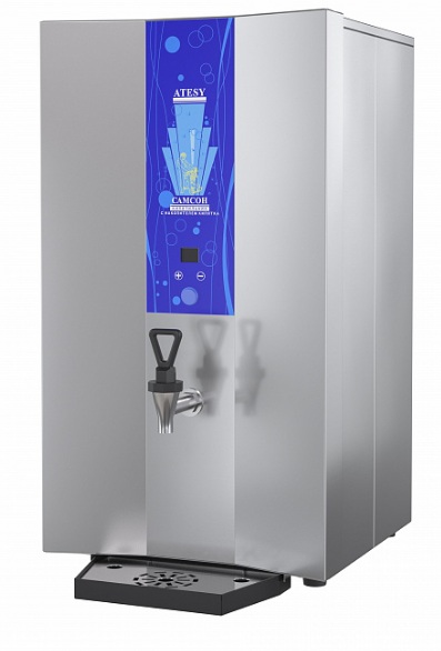 Machine professionnelle rectangulaire avec un porte-gobelet situé sous le robinet de vidange, équipée de pieds en plastique et d'un écran intégré. Le générateur d'eau bouillante amène l'eau brute jusqu'à 100 degrés, et en utilisant la fonction "réglage de la température de l'eau bouillante", il maintient automatiquement les indicateurs numériques réglés.