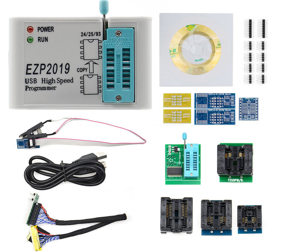 Un autre modèle de programmateur USB, produit en Chine, se caractérise par une vitesse élevée.Le corps de l'appareil est équipé de voyants lumineux qui indiquent la puissance et le processus de programmation. L'appareil appartient à l'universel et convient à la réparation d'appareils électroménagers et d'équipements industriels. Après la mise sous tension, l'appareil permet de vérifier automatiquement si le MC est conforme aux normes de sécurité, et vous permet également de télécharger le logiciel nécessaire. Avec une limitation, mais l'USB EZP2019 permet de vérifier l'intégrité du BIOS de la carte mère d'un ordinateur personnel. L'appareil fonctionne à des vitesses allant jusqu'à 12 m/s, ce qui accélère considérablement la période d'installation du pilote.