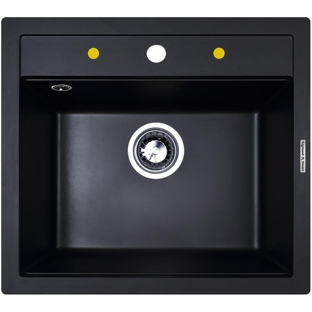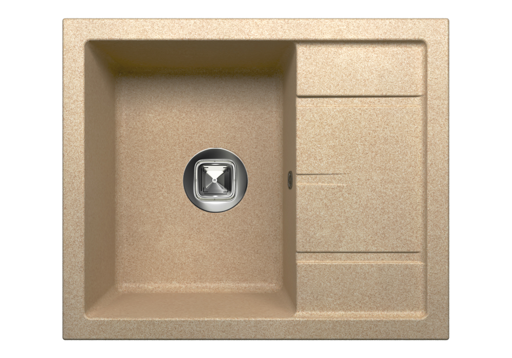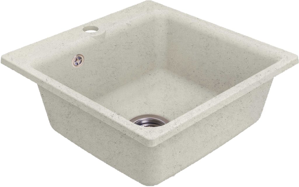Cette version de l'évier comprend tous les trous nécessaires pour une utilisation confortable. Le matériau est du granit artificiel. La forme du bol est rectangulaire.