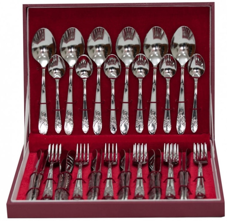 Le produit convient à tout acheteur. Même les modèles bon marché plairont à l'œil avec leur design. Toute la gamme est en métal. Les modèles plus chers sont recouverts de nitrure de titane (couleur dorée).Les produits sont livrés dans de simples emballages rectangulaires avec ou sans trous, dans des étuis doublés de satin. Un ensemble peut être composé d'éléments à usage unique (cuillères à café) ou spécifiques (par exemple, un ensemble pour un gâteau).