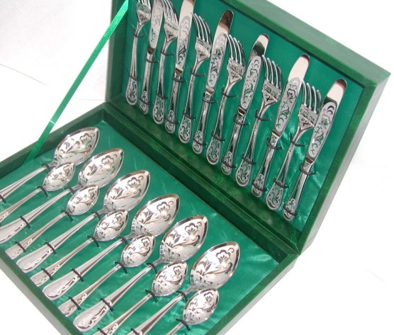 En vente, vous pouvez voir des ensembles premium coûteux pour des occasions spéciales avec des pointes plaquées or sur un support arrondi et un motif. La partie principale d'entre eux a également une configuration non standard, ce qui confère au produit un charme particulier. Tous les éléments des décors sont en argent avec une surface miroir.