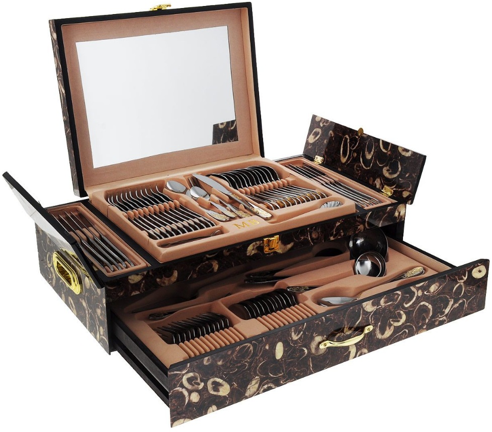 Les marchandises destinées à un grand nombre de personnes sont livrées dans un bel emballage durable - un étui décoratif original, qu'il n'est pas dommage d'offrir pour un mariage ou un anniversaire. L'ensemble comprend à la fois des couverts et des ustensiles auxiliaires (par exemple, une louche). Les produits sont fabriqués en métal à haute résistance avec un degré élevé de résistance à la corrosion.Il n'affecte pas les aliments et laisse son goût dans sa forme originale.