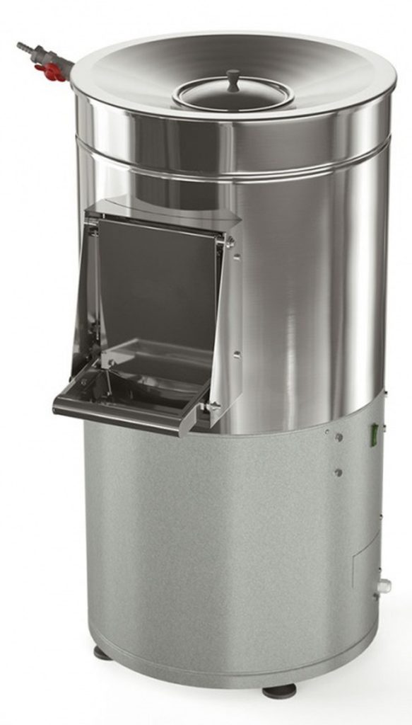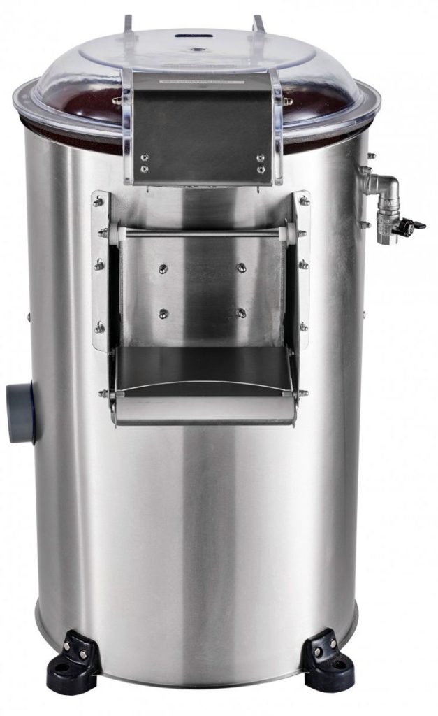 Après avoir retiré la peau, les légumes sont lavés à l'eau et transférés dans un récipient, d'où ils peuvent être retirés pour un traitement ultérieur. L'eau avec les restes de la peau va directement dans les égouts. Dans certains modèles, un piège à balles est installé au fond, ce qui vous permet de séparer la peau de l'eau afin d'éviter de boucher l'égout. L'eau propre est fournie automatiquement par le robinet.