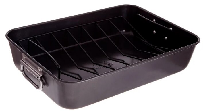 Le produit est de forme rectangulaire, noir, avec un fond plat. Il y a des côtés hauts, deux poignées latérales de couleur argent. Dispose d'un revêtement antiadhésif Whitford, d'une grille amovible.