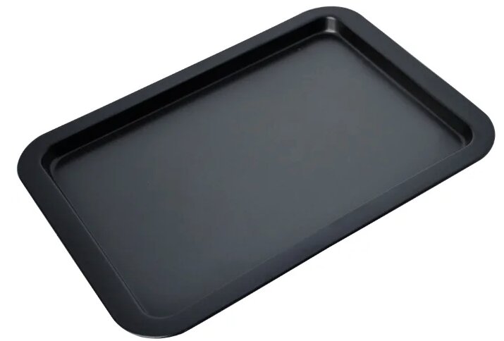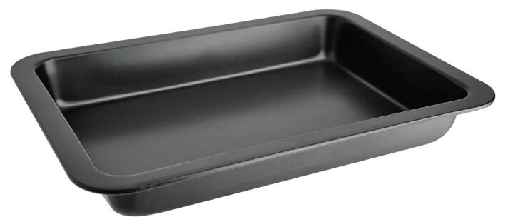 Feuille noire rectangulaire. Côté seulement d'un côté. Il est recommandé de cuire des plats (biscuits, brioches, gâteaux) qui ne permettent pas de jus, de garniture, de graisse. Peut être utilisé comme palette pour les formes non standard. Il est utilisé dans différents types de fours - gaz, électrique, convection.