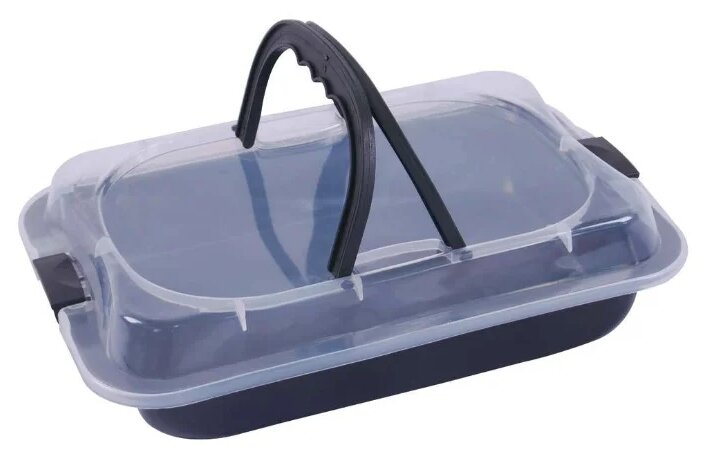Couvercle - translucide, plastique, deux poignées noires en plastique sur le dessus. Des loquets latéraux pratiques fixent solidement le couvercle sur la plaque à pâtisserie.