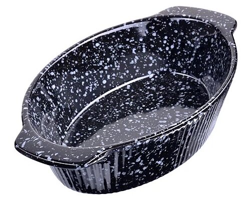 Forme rectangulaire. Deux couleurs de la couche externe - bordeaux, bleu. Couche intérieure antiadhésive noire. Vous pouvez cuire des carcasses entières de volaille, de lapin, de gros morceaux de filet mignon. Convient pour les ragoûts, les boulettes de viande, les céréales en sauce.