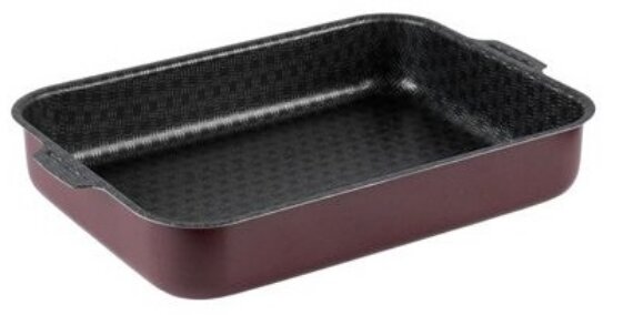 Feuille rectangulaire à bords hauts. Le revêtement intérieur est en Goldflon antiadhésif. L'ensemble est complété par un couvercle en plastique et deux poignées (transport facile).