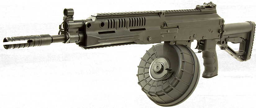 La principale caractéristique de cette mitrailleuse est un dispositif de bouche inhabituel et une extrémité avant suspendue avec des lattes. Il convient également de noter qu'il existe des trous pour l'installation de rails picatinny des deux côtés de l'avant-bras. Pour monter le viseur sur le couvercle du récepteur, il y a une barre RIS. Le reste de la mitrailleuse ressemble à un fusil d'assaut AK-12 de 2016.