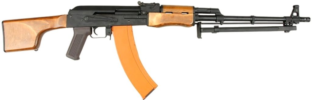 Le modèle airsoft de la mitrailleuse légère Kalachnikov ou RPK de CYMA a une belle apparence et une bonne qualité. La plupart des pièces sont en acier : culasse, couvercle de culasse, fusible, DTK, bipied, prise de gaz, baguette. Le support bipied, le canon extérieur et le bloc de visée arrière sont en alliage léger de métaux. Les parties métalliques sont peintes avec de la peinture mate.