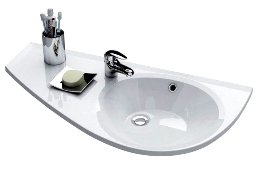 Vasque en faïence blanche. Le bol est situé dans la partie centrale, tandis que la forme de la structure est rectangulaire. Il n'y a pas de trou pour le mélangeur, mais il y a un trop-plein. Dimensions 60x45x16 cm Une étagère pratique vous permettra de ranger les détergents. Les ailes latérales peuvent également être utilisées pour cela.