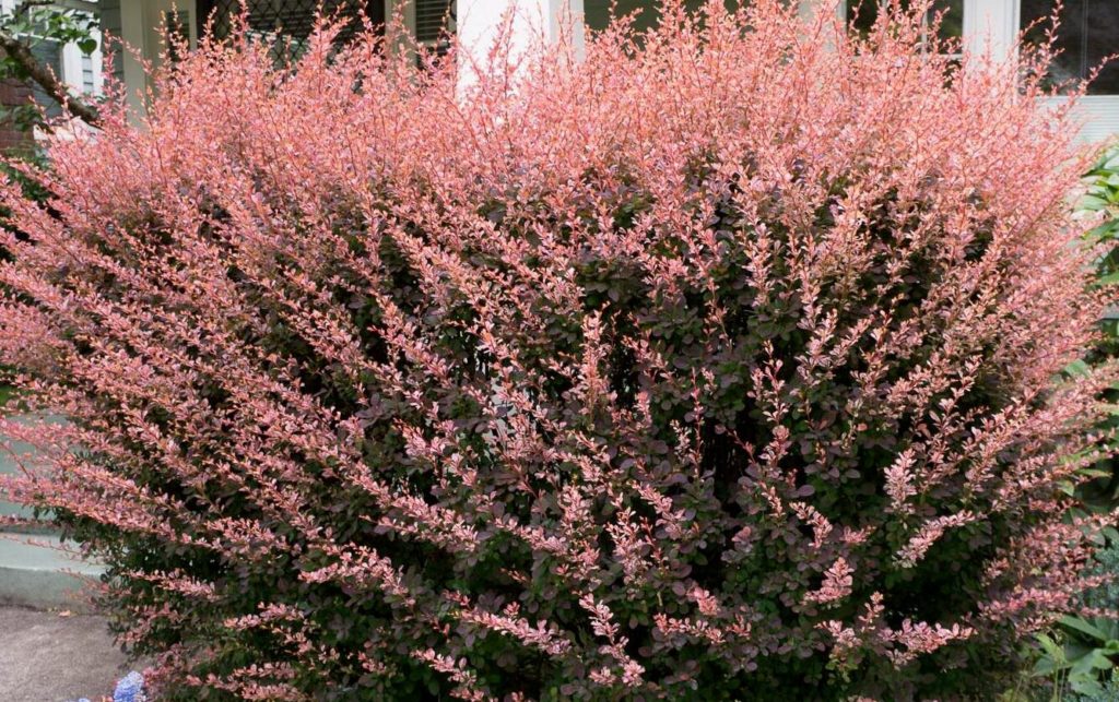 L'épine-vinette Rose Glow pousse jusqu'à 1,4-1,5 m, la principale différence étant la couleur pourpre vif des feuilles ovoïdes.La forme des pousses est verticale, à facettes, de couleur rouge foncé, il y a des épis simples.