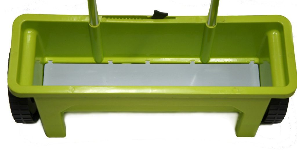 Les roues sont confortables, s'adaptent facilement même aux zones déterrées. La capacité de la trémie est de 18 kg, le poids n'est que de 4,19 kg.