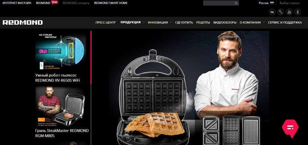 Le site comporte deux rubriques : REDMOND SMART HOME (maison connectée, cuisine), multi-cuisine (avec poêle amovible), accessoires.