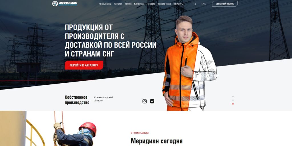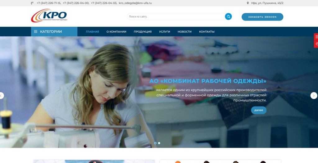 Le site de production met en avant le menu : sur l'entreprise, informations utiles, boutique en ligne, contacts. Le catalogue comprend des catégories :