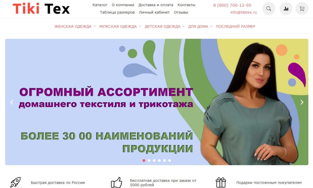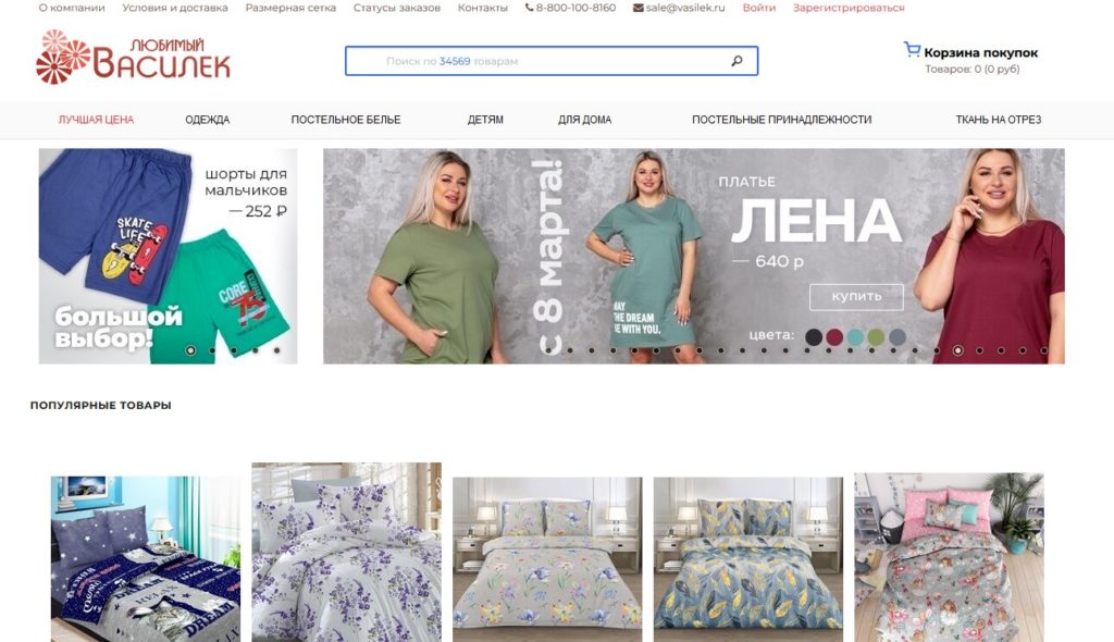 La page principale du site contient des informations sur l'entreprise, les conditions de commande, la grille des tailles, l'état de la commande. Des groupes de produits sont mis en avant : les meilleurs prix, vêtements, linge de lit, enfants, articles de maison, tissus.