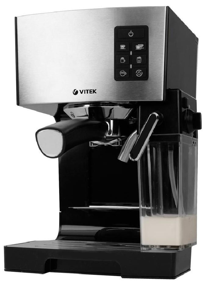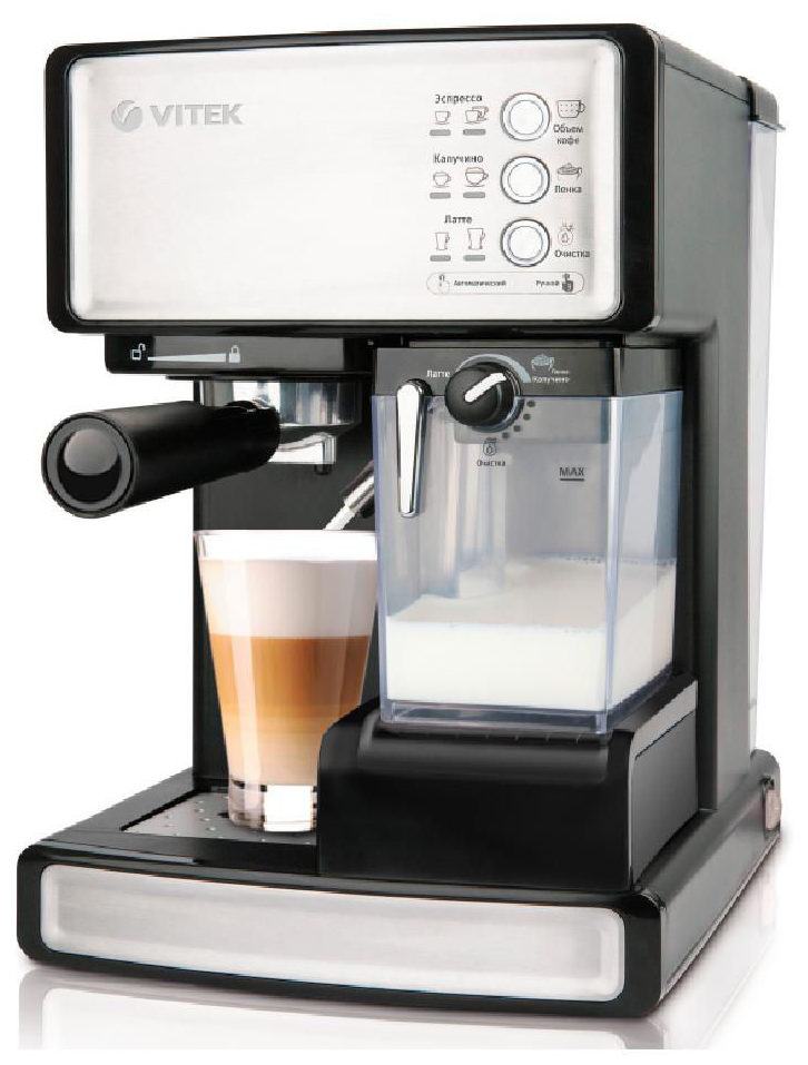 Cafetière Rozhkovy du producteur russe. Il s'agit d'un modèle classique assez simple avec des commandes pratiques. Vous pouvez préparer votre boisson préférée en appuyant sur un seul bouton. La taille des portions peut être ajustée manuellement. La pression ici est de niveau standard (15 bar). La corne est fabriquée selon la technologie « Perfect Brewing », grâce à laquelle la mousse de lait est épaisse et moelleuse. "VITEK VT-1522 BK" est équipé d'un cappuccinatore automatique. Le corps est en acier inoxydable et en plastique. Le volume du réservoir d'eau est de 1,4 litre. Le coût moyen de "VITEK VT-1522 BK" est de 15 905 roubles.
