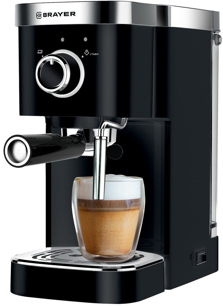Le boîtier de l'appareil est en plastique noir et en acier inoxydable. La corne est en métal. La commande est simple, de type tactile, les boutons sont équipés d'indicateurs, il est donc facile de suivre les étapes de préparation d'une boisson.La surface sur laquelle les tasses sont placées n'est pas rayée et résistante aux dommages mécaniques mineurs, grâce à quoi le BRAIER BR-1101 conserve longtemps son aspect esthétique. Le coût moyen est de - 9 590 roubles.