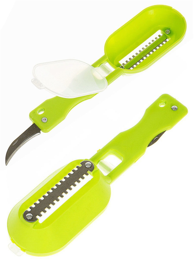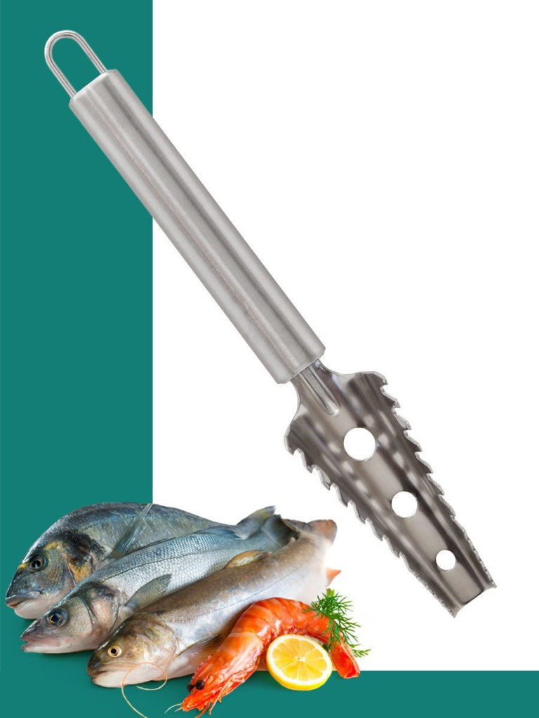 Ainsi, un grattoir pour enlever les écailles de poisson peut être entièrement en métal, en divers alliages, en plastique ou combinés. Sa forme est comparable à celle d'un couteau à bords longitudinaux dentelés, d'une figurine de poisson ou d'une brosse de massage à base et manche ronds. Dans ces produits, les dents sont disposées de manière à ce que pendant le fonctionnement, les écailles individuelles ne se dispersent pas, mais se déposent à un certain endroit.