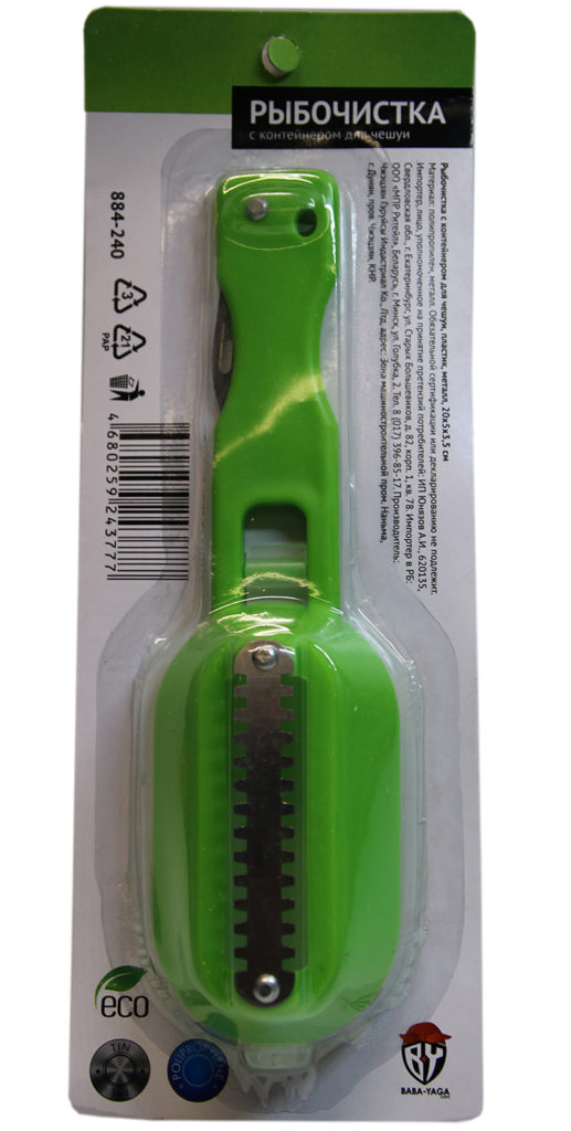 Les produits de la société de fabrication Vetta ont attiré leurs clients avec la présence d'un conteneur spécial pour les balances. La forme ergonomique pratique vous permet de tenir confortablement l'outil dans votre main.Fabriqué en plastique de haute qualité, avec des lames en acier horizontales, le détartreur de poisson nettoie rapidement et efficacement la carcasse de poisson des écailles. Elle, à son tour, ne se disperse pas sur les côtés, mais est soigneusement collectée dans un récipient spécial qui, au fur et à mesure qu'il est rempli, se nettoie facilement.