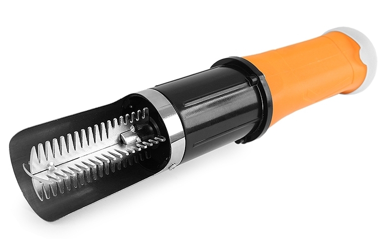 Le corps de l'appareil est scellé, ce qui permet de le laver sans crainte d'abîmer les pièces. Le boîtier métallique protège les doigts des dommages et protège le mécanisme de nettoyage des influences mécaniques. Cette partie peut être déplacée et le poisson peut être nettoyé du côté gauche.