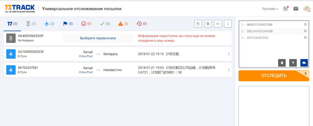 Ce site sera une solution idéale pour les accros du shopping qui achètent en ligne. Une caractéristique est l'affichage d'informations immédiatement après l'enregistrement du fret postal. Plusieurs numéros de piste peuvent être affichés en même temps. L'utilisateur pourra, à l'aide de réglages manuels, surveiller le mouvement non seulement en Chine, mais également dans d'autres pays.