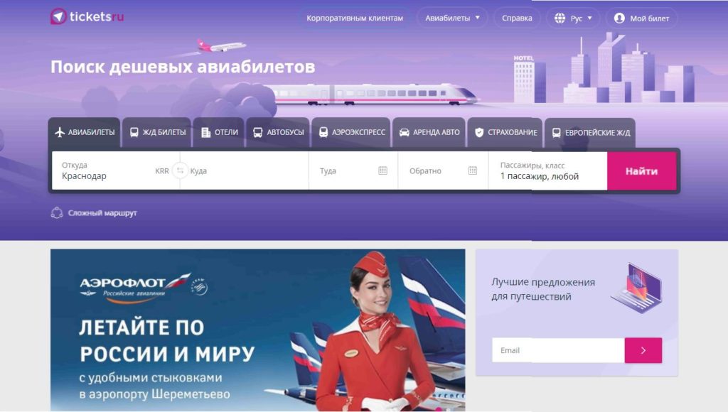 Un site qui bat tous les records de fréquentation. Vous pouvez y réserver des billets non seulement pour les trains et les trains électriques, mais également pour les avions et les bus. Les visiteurs sont aidés dans le choix des visites et des hôtels, ici ils peuvent organiser un voyage d'affaires et même réserver des places sur les trains Aeroexpress qui circulent à Moscou entre les stations de métro et les aéroports.
