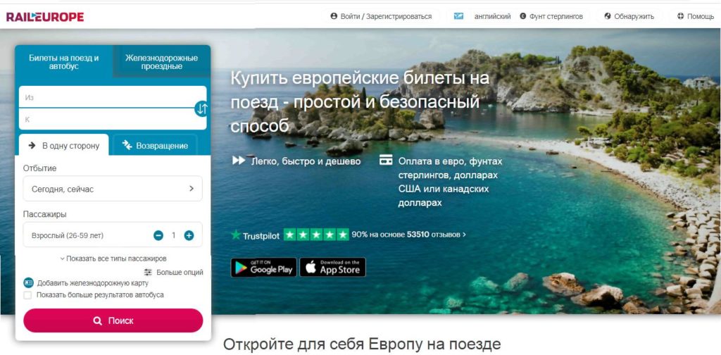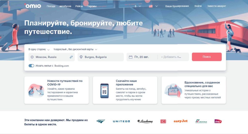 Sur ce service, vous pouvez acheter des billets non seulement pour les trains, mais aussi pour les avions, les bus et les aéroexpress. La société coopère avec un grand nombre de transporteurs européens.Vous pouvez payer avec Visa ou MasterCard.