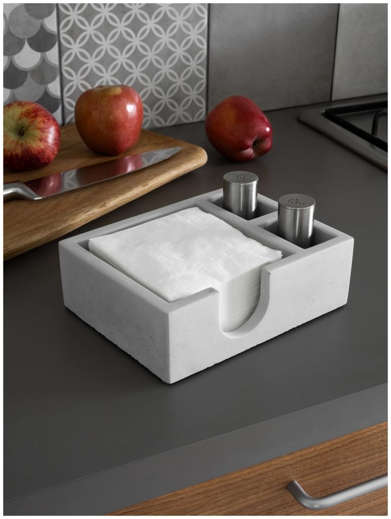 L'entreprise se spécialise dans la fabrication d'accessoires en béton, mais un autre porte-serviettes avec des évidements pour les épices est une combinaison de praticité et de style. Le titulaire sera pertinent dans n'importe quelle situation dans un intérieur de maison ou un café d'été.