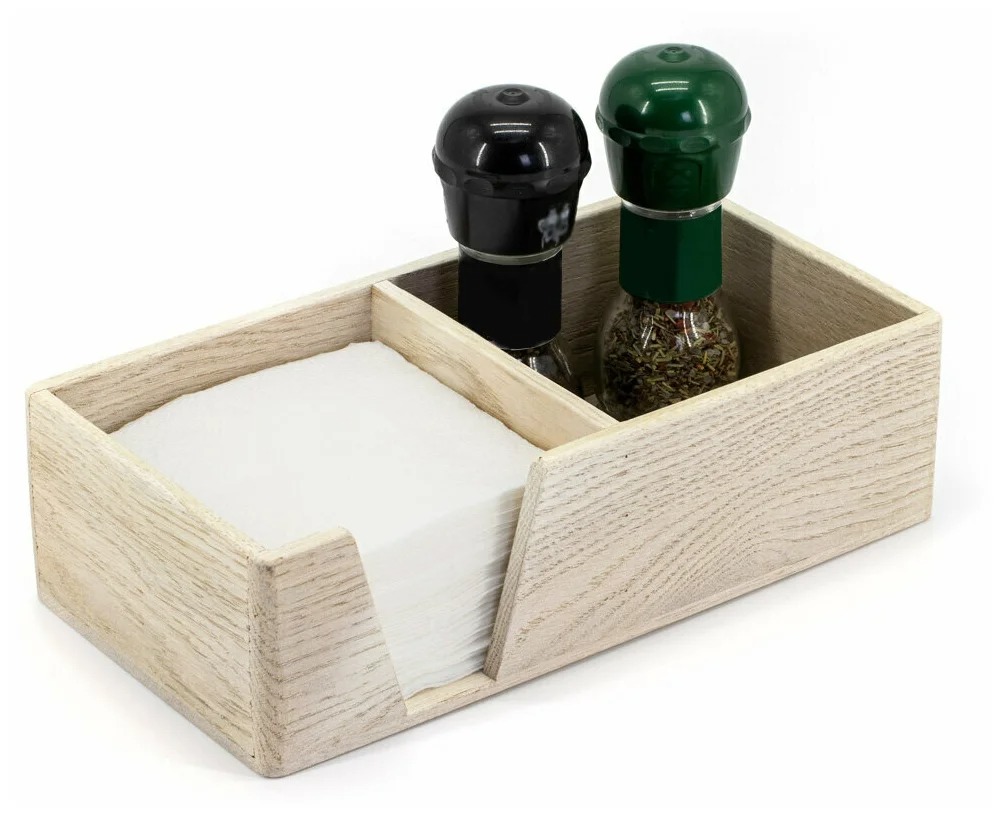 Les produits en bois ont toujours l'air élégant et noble, ce modèle de la marque nationale peut s'en vanter. L'accessoire a un dessus ouvert et peut servir non seulement de support pour les produits en papier, mais également d'évidements pour les épices. Une petite chose à la mode sera un excellent ajout à votre table de tous les jours ou formelle.