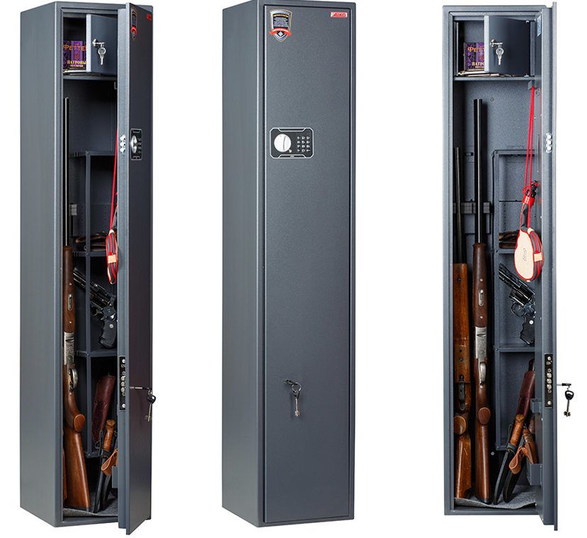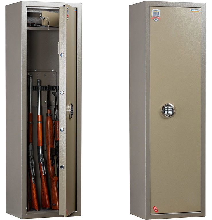 Le coffre-fort de la production nationale a une grande capacité (jusqu'à cinq armes) et une serrure électronique qui permet une ouverture rapide de la porte en cas d'urgence. Livré avec une clé de secours. La hauteur du compartiment intérieur est de 1430 mm, l'espace sur le dessus est libéré pour les armes grâce à un teaser plus étroit qui n'atteint pas la paroi arrière. Classe de résistance à l'effraction II. Poids - 178 kg. Par conséquent, les trous pour les fixations d'ancrage ne seront probablement pas utiles. Pour la même raison, les attaquants ne pourront pas sortir ce coffre-fort de la pièce.