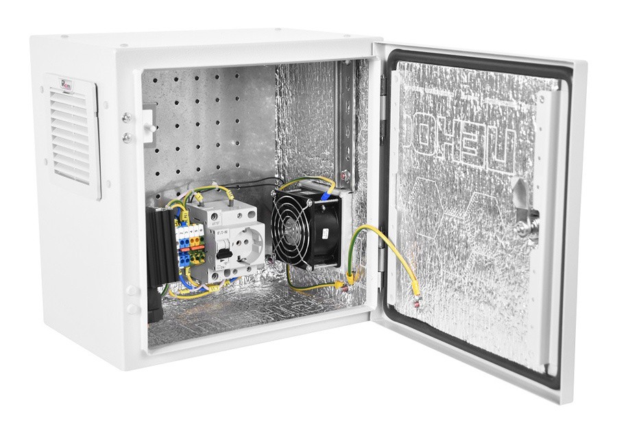 À l'intérieur se trouve un matériau calorifuge qui réfléchit le rayonnement des composants électroniques et électriques. La chaleur s'échappe par la paroi arrière perforée. En hiver, le gel ne peut pas pénétrer à l'intérieur et interférer avec le fonctionnement des équipements installés.