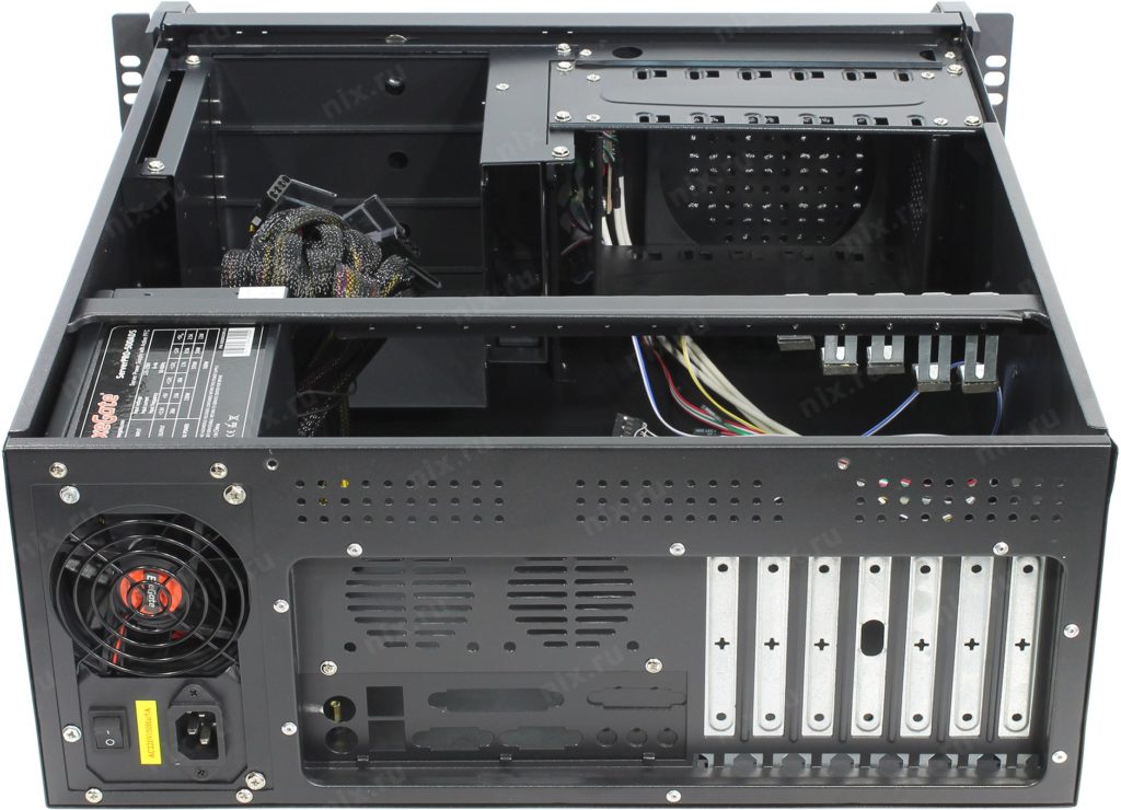 En fait, le boîtier du serveur est un ensemble complet d'équipements pour stocker des informations. Baie séparée pour cartes mères 4U, baies de lecteur, ventilateurs de refroidissement. Il y a des interrupteurs sur le panneau avant.