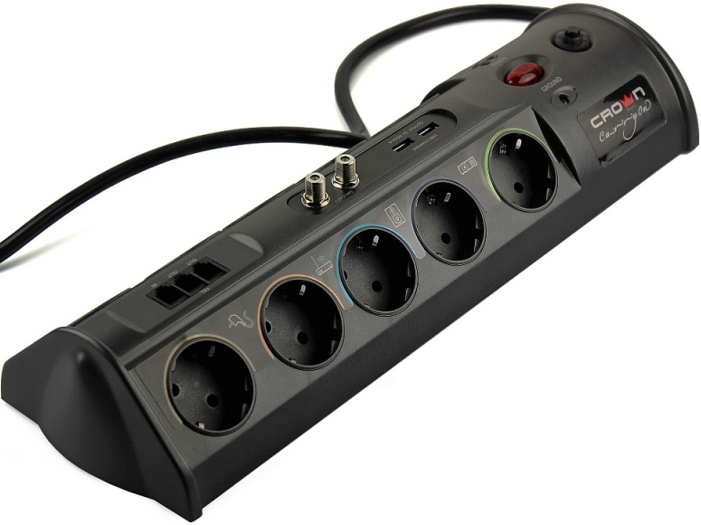 L'intérieur du filtre se compose de 5 prises Euro 10 A chacune et de 2 connecteurs USB 2,5 A. Les nœuds de charge sont protégés par des obturateurs et une mise à la terre, et non loin de l'interrupteur se trouvent 2 diodes lumineuses chargées d'informer l'utilisateur du niveau de protection.