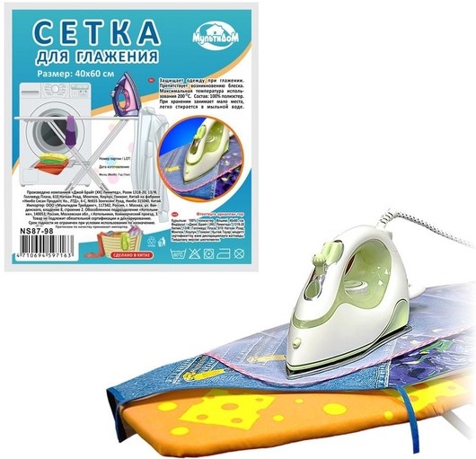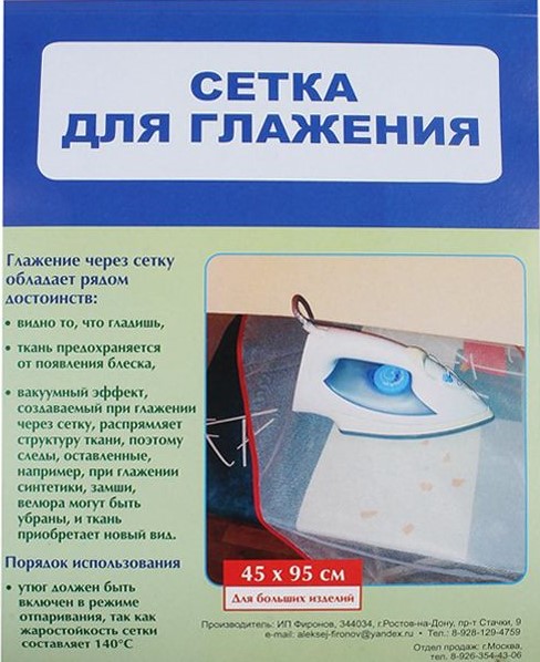 Les produits résistent à des températures allant jusqu'à 200 degrés, parfaits pour une utilisation en conjonction avec un générateur de vapeur. Taille optimale pour repasser des vêtements de toutes tailles, y compris des pantalons plissés, des jupes plissées, des chemisiers en mousseline. La maille fine élimine la possibilité de brillance brillante. Prix : 290 roubles.