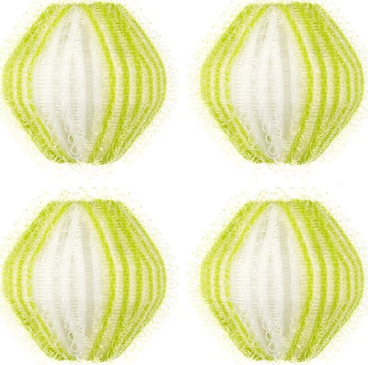L'ensemble contient 4 pièces d'un diamètre de 35 mm. Chaque balle a une forme allongée, couleur principale blanche. Des fils vert clair sont enroulés sur une base blanche.