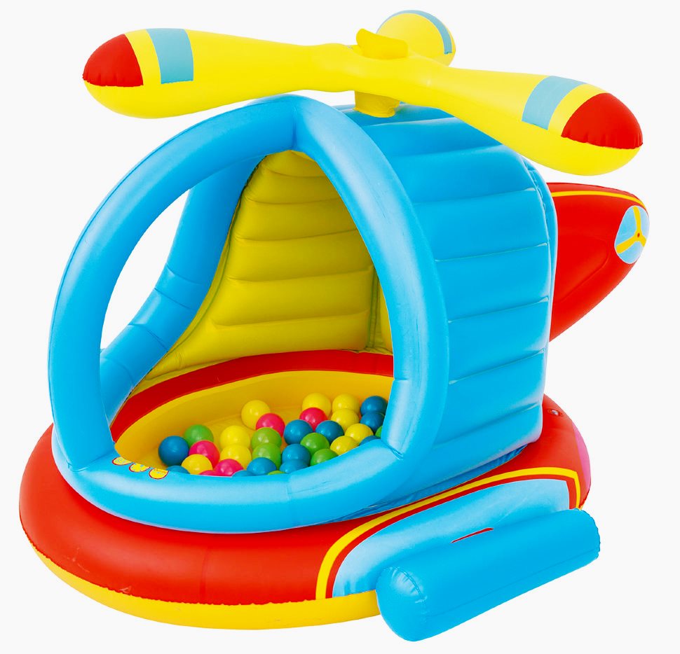 Pas tout à fait une conception ordinaire, qui est faite sous la forme d'un hélicoptère. Nous vous conseillons d'acheter ce modèle pour ceux qui ont des petits garçons qui grandissent dans la famille. Si nécessaire, la conception est rapidement dégonflée et pliée dans une boîte compacte. Le fabricant garantit une longue durée de vie du produit. Des murs denses protégeront le bébé non seulement en cas de chute, mais également d'éventuelles blessures.Les balles sont incluses, mais vous devrez acheter plusieurs sacs. Convient aux jeux actifs 1-3 enfants. Le poids de l'avion plié est de 3 kg.