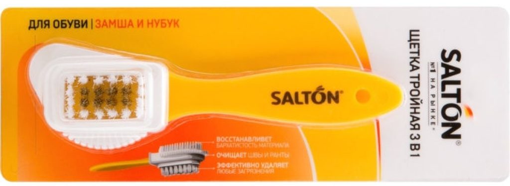 Salton pour le daim a trois surfaces de travail, l'une composée de poils et de fil de laiton, qui nettoient rapidement et efficacement le matériau. Les parties latérales de la brosse sont en caoutchouc et sont conçues pour nettoyer les coutures et les trépointes, la troisième partie est constituée de poils en caoutchouc, avec lesquels vous pouvez restaurer la surface veloutée.