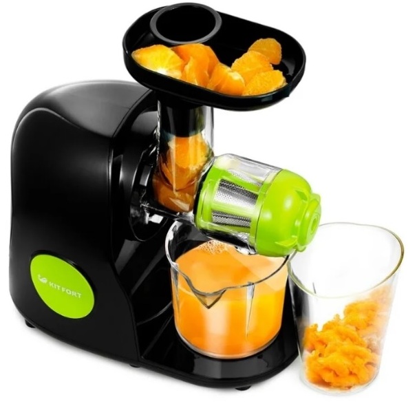 Modèle "KT-1111" de la société "Kitfort" en fonctionnement, séparation du jus et du gâteau dans différents conteneurs