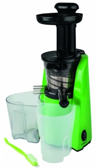 L'appareil a un design original. Corps en plastique vert. Contrôle mécanique. Les pieds sont caoutchoutés et adhèrent bien à la surface de la table. Depuis les systèmes, il y a une alimentation directe en jus et un "drop-stop". La présence d'un mode doux évite l'oxydation des produits. Ce modèle fonctionne à basse vitesse et retient les microéléments utiles jusqu'à 85 %.