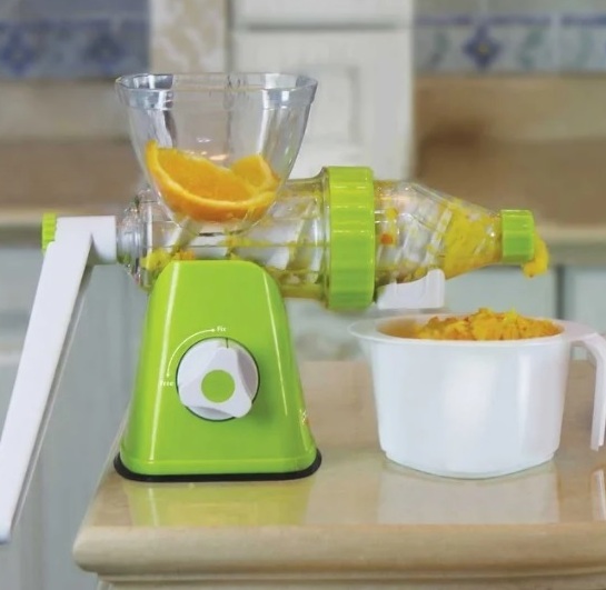 Presse-agrumes manuel avec deux récipients : pour le jus et pour la pulpe. Le corps est en plastique. Couleur - vert clair avec des éléments blancs. La semelle est en caoutchouc, fixée à la table comme une ventouse, la surface doit donc être parfaitement propre. Design de l'extracteur de jus : une bouteille équipée de divers accessoires.