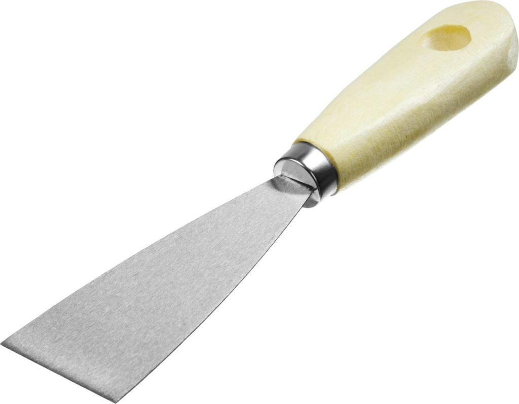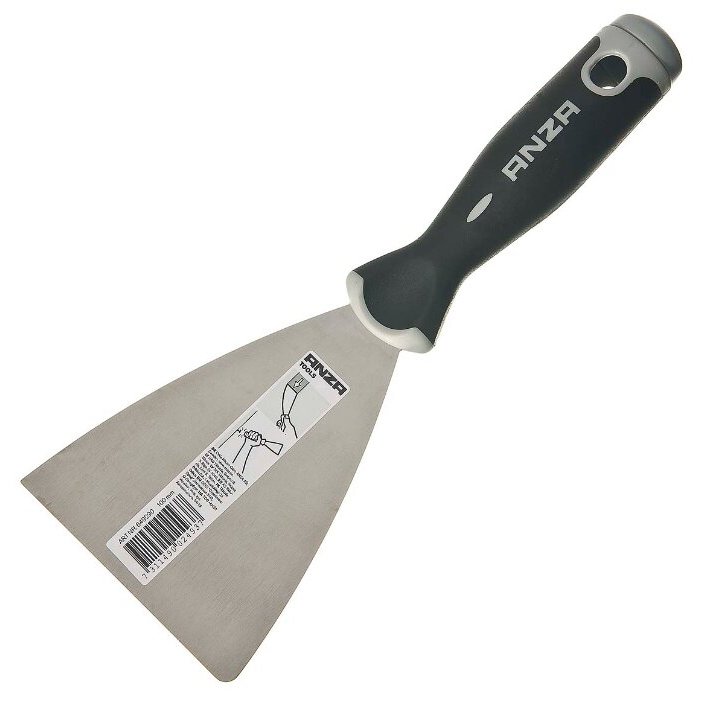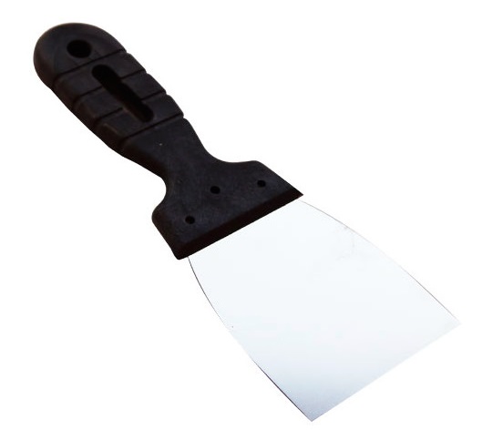 La lame de la spatule ressemble en apparence au concurrent précédent et se distingue par une plus grande largeur de la toile (10 cm). Le grattoir à spatule est utilisé pour appliquer et niveler le mastic sur diverses surfaces. Le matériau de la lame est en acier inoxydable, le manche est en plastique. Le poids du produit est de 89 grammes, de sorte que la main ne se fatigue pas pendant le fonctionnement. La poignée a des fentes pour éviter de glisser de vos mains. Le prix moyen d'un produit est de 40 roubles.