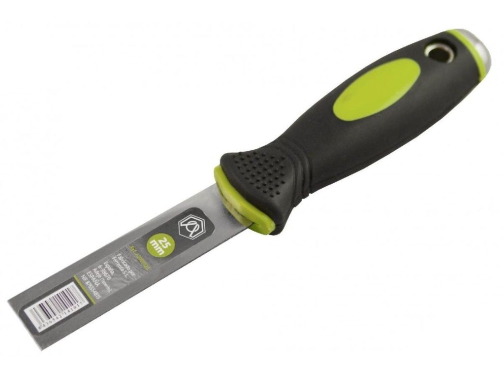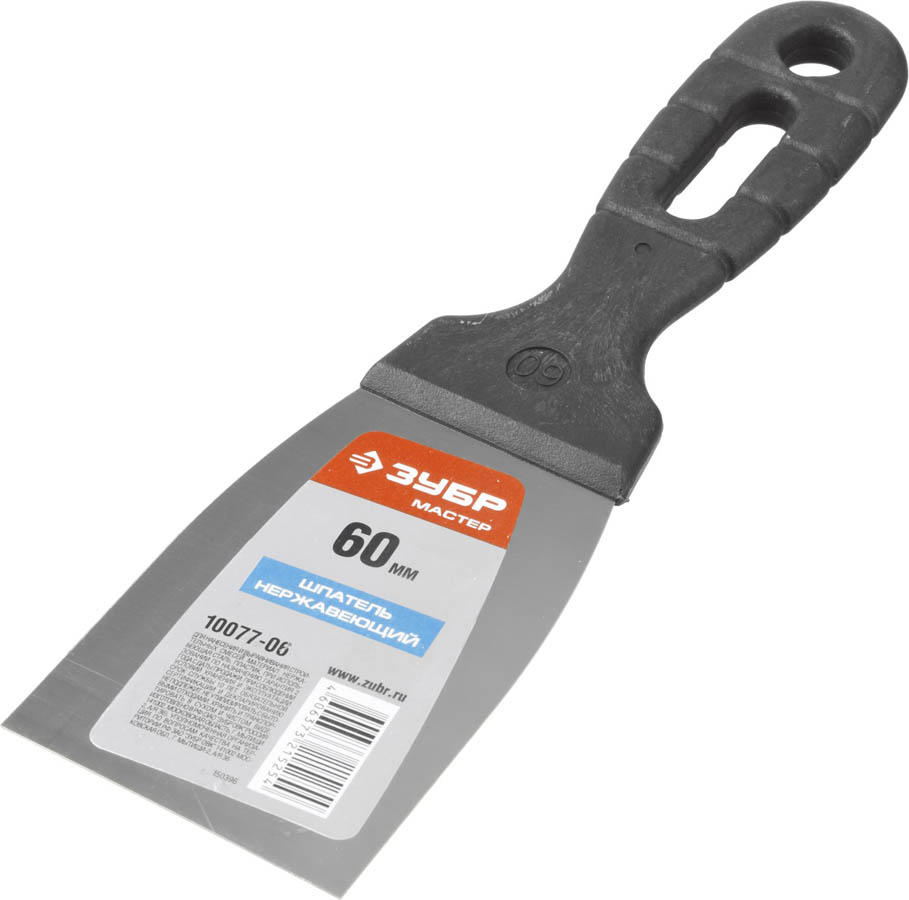 Un autre modèle populaire que l'on trouve en vente partout. Comme le concurrent précédent, la lame de la spatule est en acier inoxydable, mais le manche est en plastique. La largeur de la surface de travail de 6 cm rend le grattoir universel, lui permettant d'être utilisé non seulement dans des endroits étroits, mais également dans de vastes zones.Le plus souvent, il est utilisé pour niveler le mastic lors de la finition. Le manche avec un motif en relief tient confortablement dans la paume de votre main et présente un avantage significatif par rapport à un manche en bois: il ne gonfle pas au contact de l'eau et est bien attaché à la lame. Le produit est fabriqué en Russie et peut être trouvé non seulement dans les hypermarchés de la construction, mais également commandé en ligne dans une boutique en ligne. La poignée a un trou pour le montage mural. Le prix unitaire moyen est de 22 roubles.