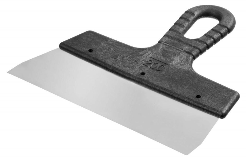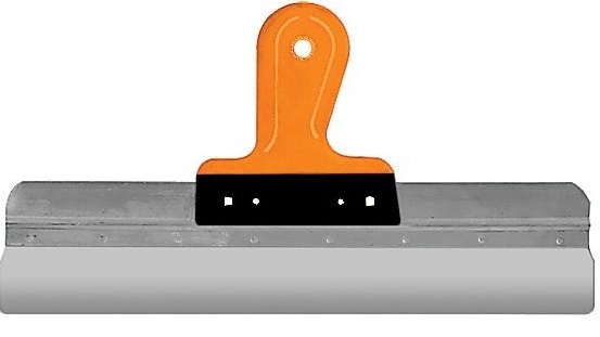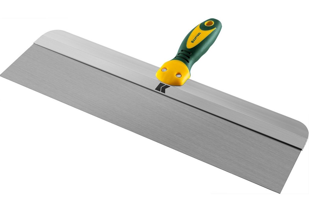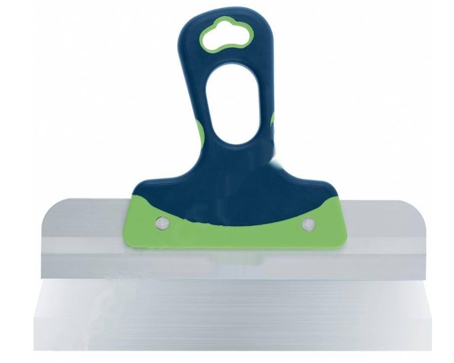Ainsi, avec lui, vous pouvez nettoyer les murs de papier peint ou travailler avec des surfaces en bois. S'il est nécessaire de traiter une zone difficile à atteindre, vous pouvez acheter une rallonge de marque qui vous permet d'appliquer des mélanges à une grande distance du maître. En plus du mastic, du mastic, de la colle et de toute autre composition visqueuse peuvent être nivelés avec une spatule. La largeur de la toile de travail est de 10 cm, elle est en acier inoxydable poli. La poignée est en plastique, avec des inserts caoutchoutés, a une forme qui répète la courbure d'une main humaine. Il y a un revêtement antidérapant. Le dessus a un trou pour le montage mural. Le prix moyen d'un produit est de 750 roubles.
