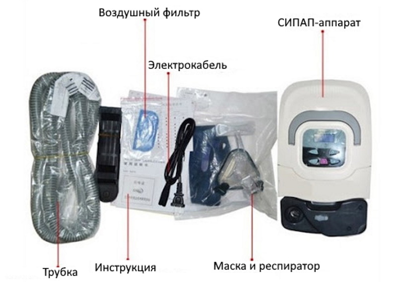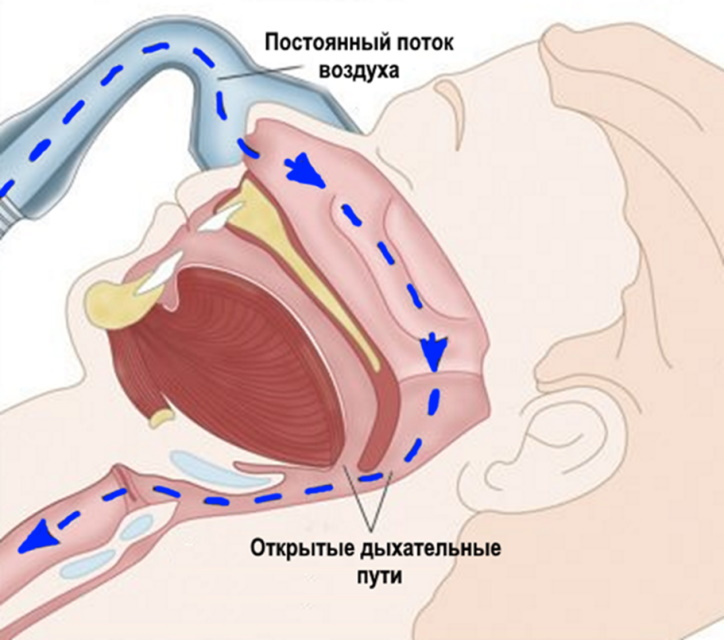 L'appareil CPAP et les organes respiratoires (alvéoles, bronches, voies respiratoires) créent un système fermé dans lequel l'air entrant dans les poumons humains augmente la pression dans la poitrine. En conséquence, un «coin» d'air particulier qui apparaît contribue à l'extension de la racine de la langue, à l'expansion de la lumière des voies respiratoires, à la stabilisation des tissus mobiles du pharynx et de la luette palatine avec la disparition des voies respiratoires arrestation, ainsi que le ronflement.