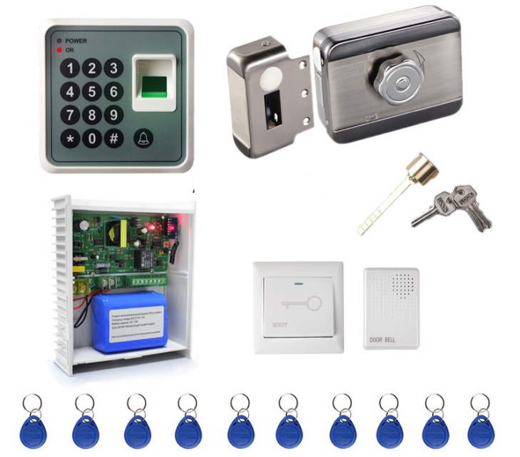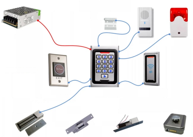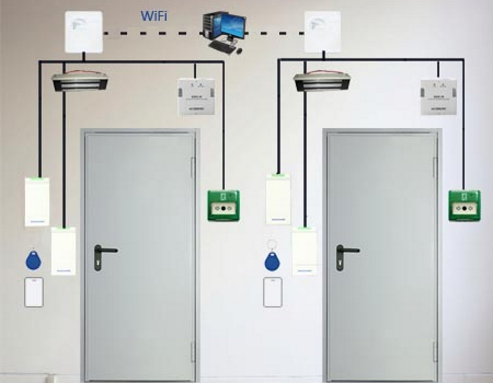Les composants sont reliés par un câble dont le nombre de conducteurs est déterminé par le schéma d'installation. Habituellement, un câble de signal à six ou huit conducteurs est utilisé. Lors de l'installation d'une serrure sur une porte, une transition de porte est utilisée pour la protection mécanique. Le contrôleur et l'alimentation sont montés à l'intérieur sur le mur dans des endroits à faible trafic dans un cas particulier. Les bornes sont fixées selon les instructions de couleur.