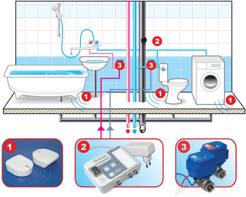 La gamme de systèmes de protection est large, allant des simples dispositifs de signalisation qui émettent un signal sonore spécial en cas de fuite, aux structures plus complexes qui peuvent complètement couper l'alimentation en eau de la pièce.