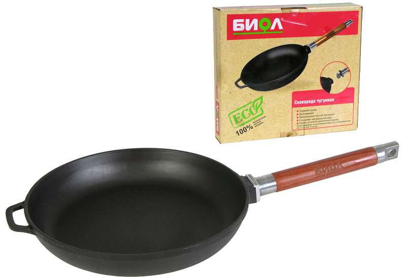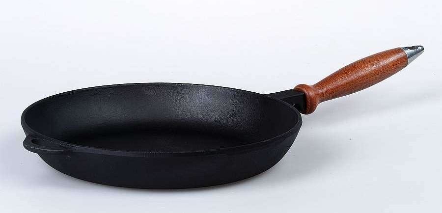 Une autre casserole ronde classique en fonte avec une poignée en bois, bien que déjà non amovible. Pour la friture, vous n'avez pas besoin de beaucoup d'huile, les crêpes se retournent facilement et, grâce à un chauffage uniforme, elles sont luxuriantes, avec une croûte dorée uniforme.
