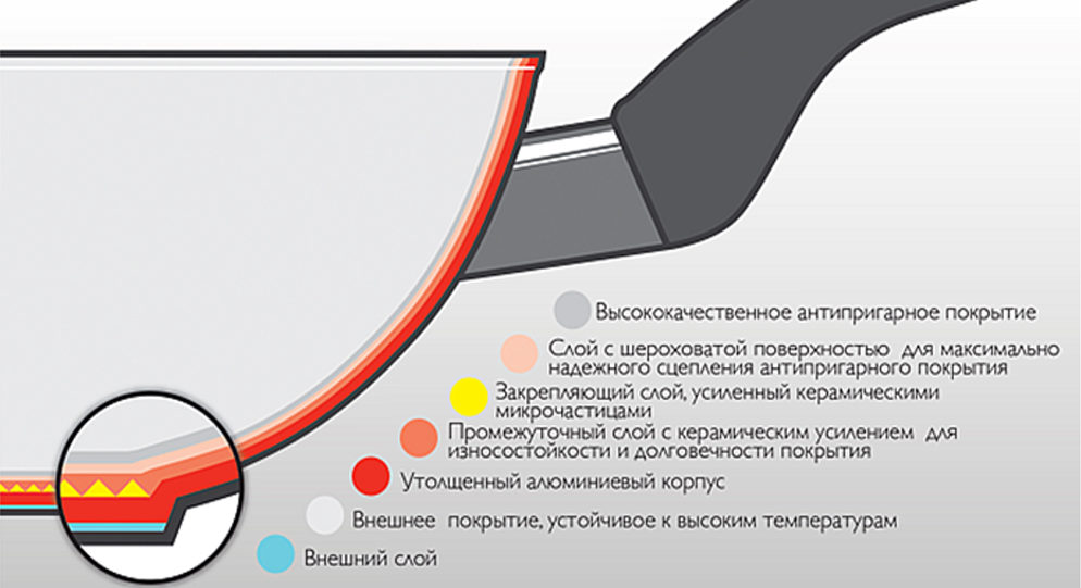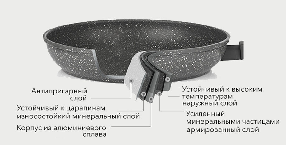 Il diffère du Téflon par la présence d'éclats de marbre dans la composition. Un tel revêtement est plus solide et plus durable, ne s'effondre pas sous une forte incandescence.