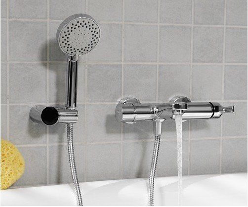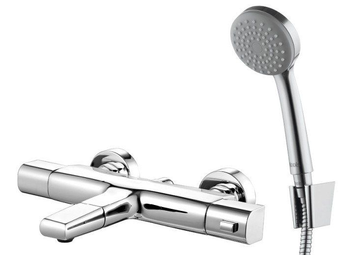 Robinet de bain thermostatique avec douchette. La particularité de ce modèle est que sa connexion au système d'alimentation en eau ne dépend pas de l'emplacement des conduites d'eau chaude et froide. L'inverseur en céramique (interrupteur de douche) est durable, mais nécessite un nettoyage périodique du calcaire dans l'eau dure. La finition chromée est résistante aux rayures et conserve longtemps son éclat (avec un entretien approprié).